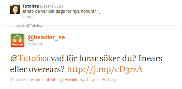 I mitt nya ehandelsprojekt Headler bevakar vi kontinuerligt bloggar och Twitter efter potentiella köpare som skriver att de ”ska köpa hörlurar” eller ”behöver nya hörlurar!”, som vi sedan svarar med förslag. Konverteringen har varit uppemot 25% hög.